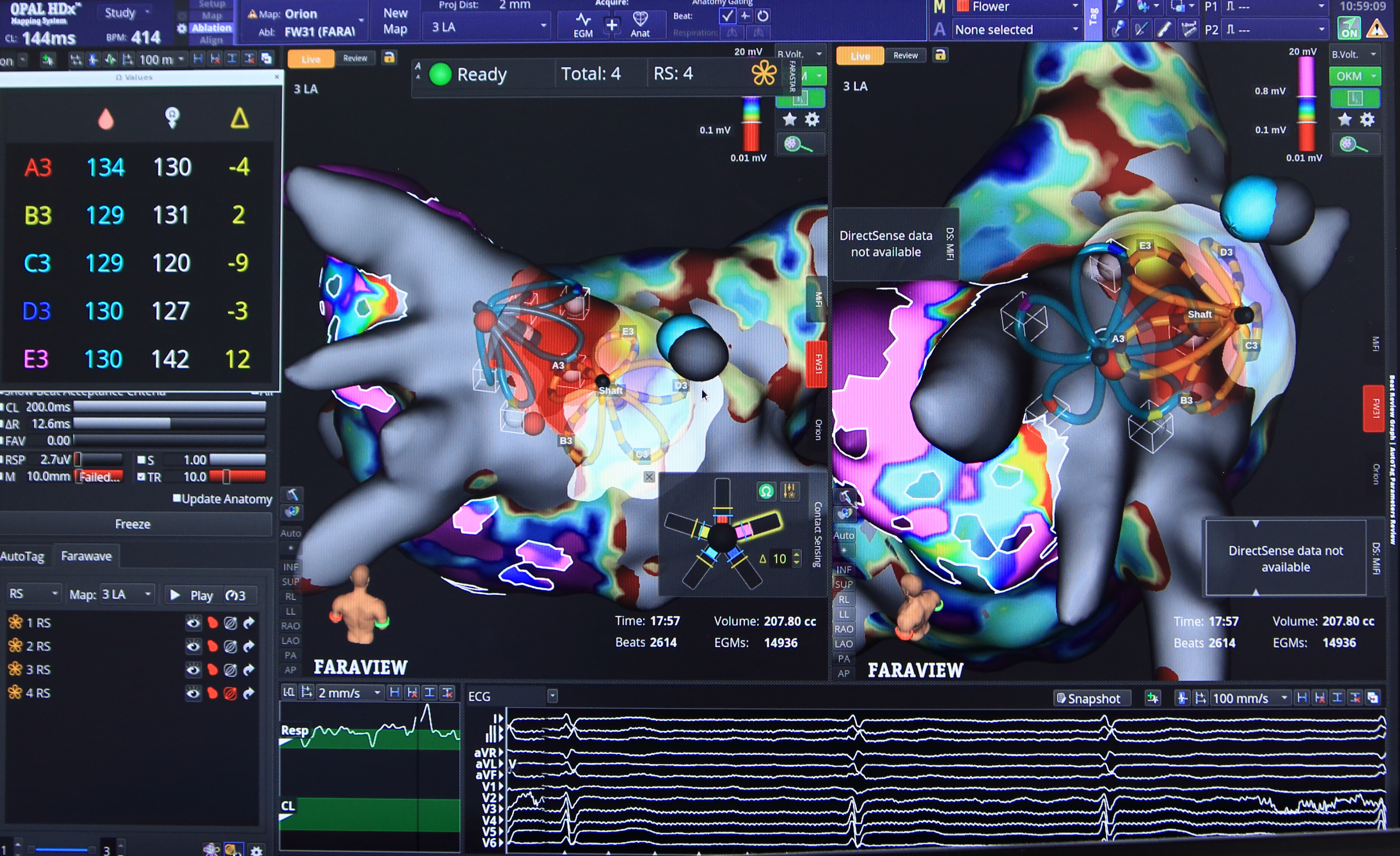 心臓の中を正確に把握するための3Dマッピングシステムですが、当院では主要な全メーカーの最新システムを導入しています。複雑な心臓の形であっても、どのシステムが最適かを見極め、迷いのない正確なカテーテル操作を実現します。